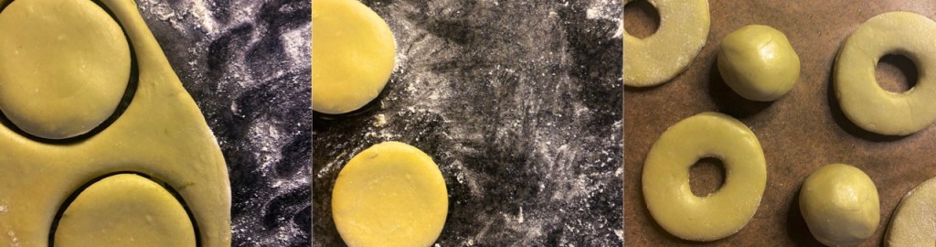 Step 6: Gently roll the dough out into a 1 cm thick rectangle. Cut out 6 normal sized or 12 mini doughnuts. I used a normal cookie cutter (see above) and then used the bottom of a shot glass to cut the inner circle. See below.